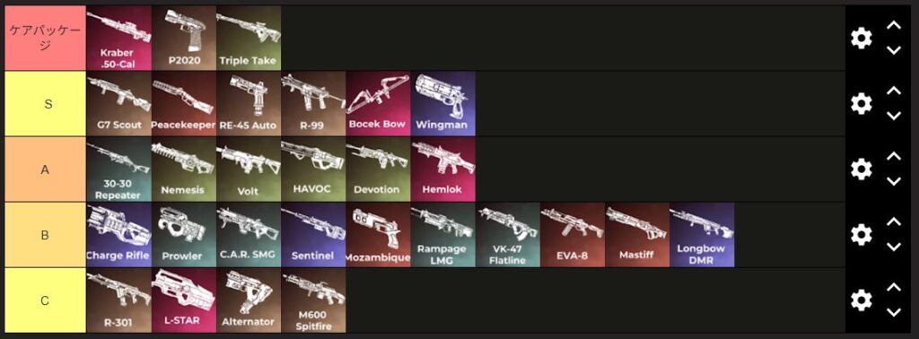 ・近距離はピースキーパー・RE-45・R99はほぼ横並びといった状況で、使っているキャラや得意な武器を使うと良いと思います。