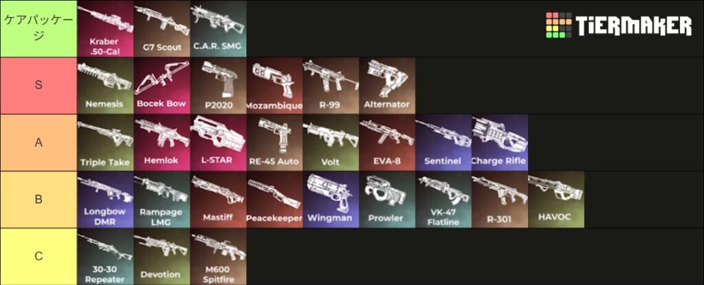 ・近距離は安定をとるなら、アキンボP20 or R-99。上振れを狙うならオルタネーター or アキンボモザン or RE-45です。この5つに関しては好みやレジェンドによって変わりそうです。アタッチメントの重要度からRE-45のみA tierとしました。